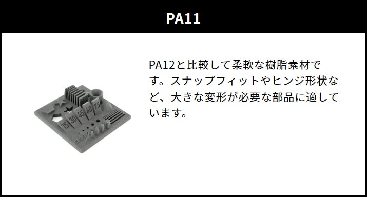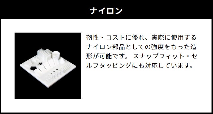 ナイロンは、耐熱性と靭性に優れた樹脂のため、実際に使用するナイロン部品としての強度を持った造形が可能で、スナップフィットやタッピングネジに適応しています。また、この素材は非常に多用途で、アイディア次第で様々なものを作ることが可能です。薄い形状であれば柔らかく、厚い形状になると硬くなる特性があるため、それらの特性を用いた機械部品なども作ることができます。