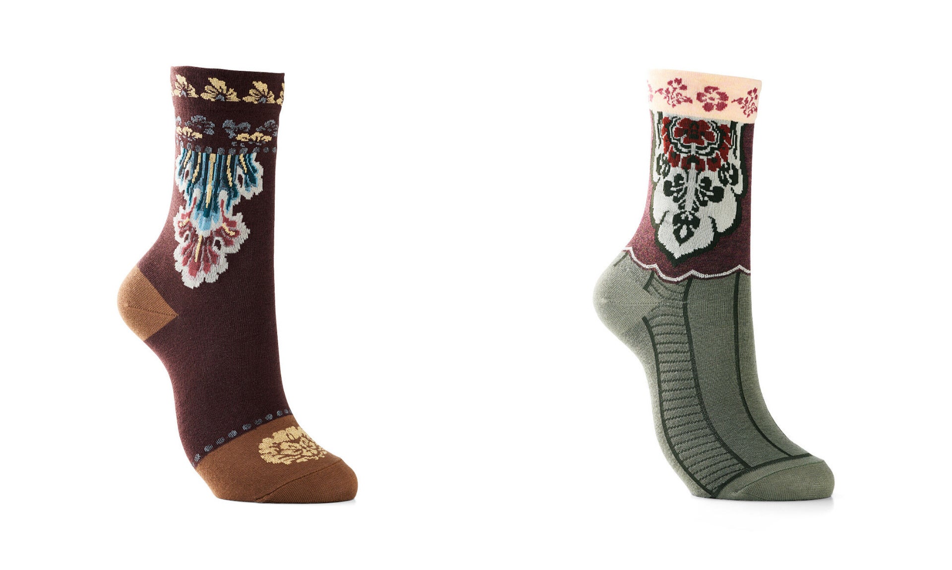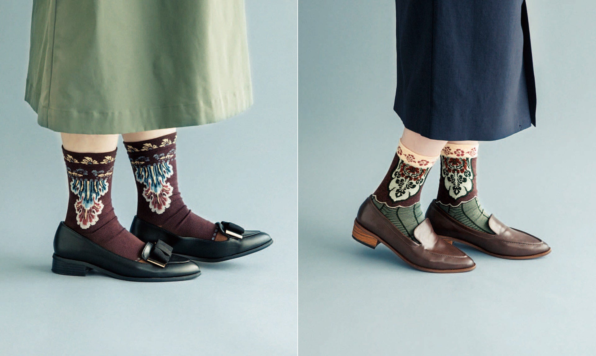 仏前に供物を献ずる台机、献物几(けんもつき)の足の装飾を、足もとでおそろいにして楽しむことができる靴下。足先やはき口の模様、モチーフの再現度など、細かい部分にまでこだわりが感じられるデザインです。さらっとはけて、コーデのワンポイントとして足もとを華やかに演出してくれます。しっかりと個性を醸し出す意匠にも注目です。