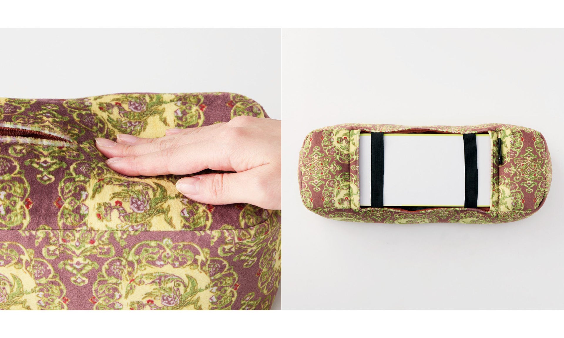 聖武天皇ご愛用の豪奢な肘置きがモチーフのティッシュカバーです。ぐるりと取り囲むように描かれた鳳凰の配置まで本物にならって合わせられていて、サイズは1/2でも存在感のある仕上がりになっています。肘置きとしての使い心地を考えて、中にわたが詰められているので、ちょっとしたクッション代わりとして、気軽にもたれかかることもできます。