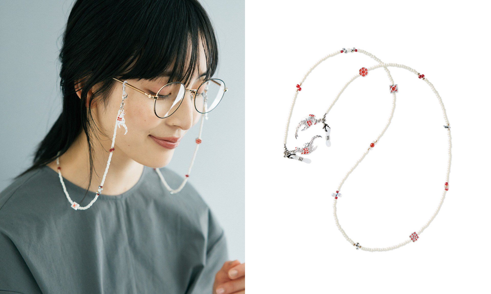 阮咸(げんかん)に描かれた綬帯(じゅたい)という組ひもをくわえたインコを立体的に表現したグラスコードです。きらりと輝くパーツの連なりが、着けるだけで顔まわりをパッと華やかに演出してくれます。ネックレスやブレスレットにもなるので、その日の気分やコーデに合わせて使い方を選べるのもポイントです。荘厳なインコのチャームは取り外しができ、雰囲気を変えて楽しむこともできます。