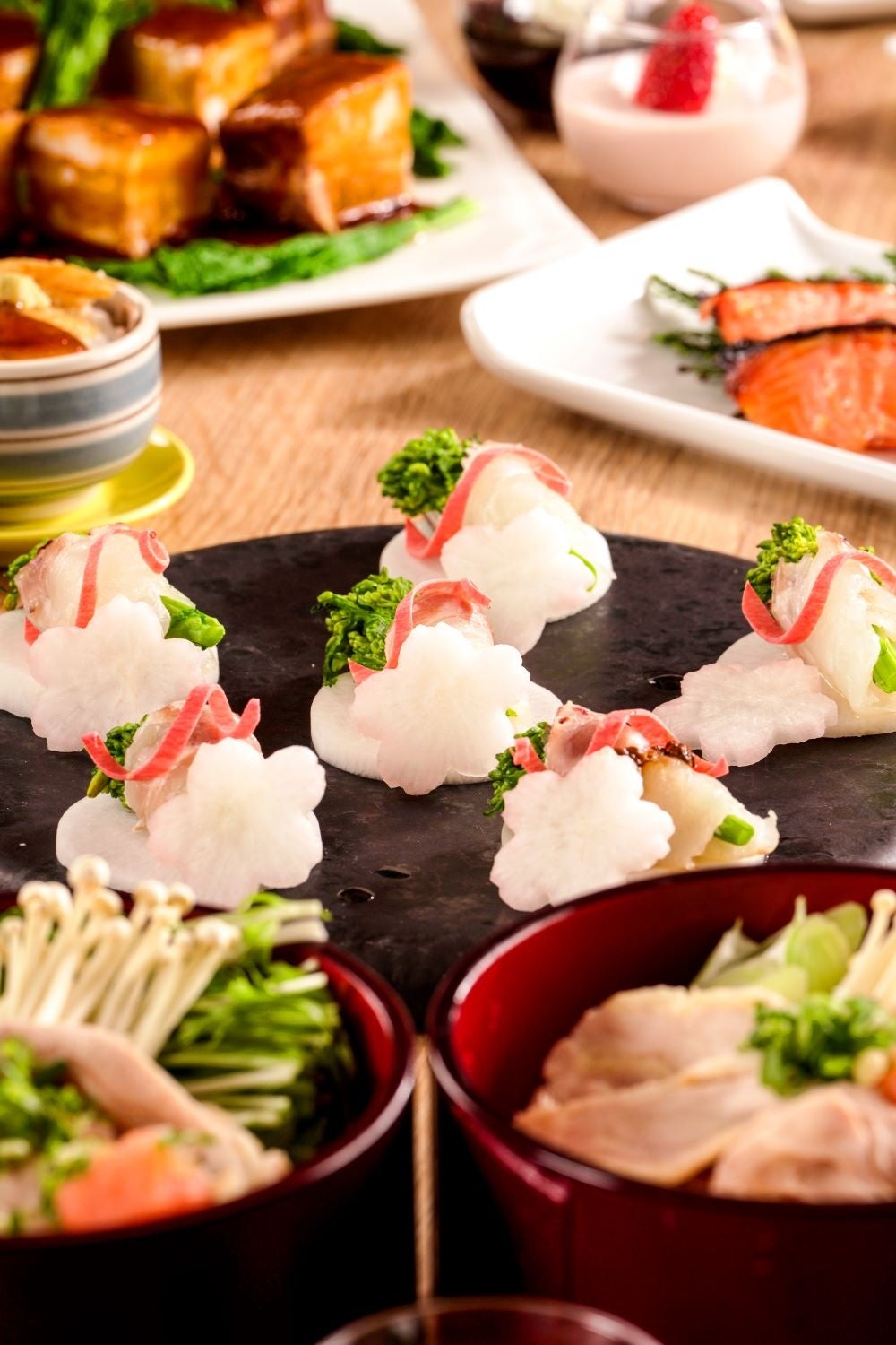 思わず「食べたい!」と手が伸びるような和食メニューが充実。春の息吹を感じる「鯛と菜の花 実山椒オイル掛け」をはじめ、上品な「鰻白醤油焼き」、目にも鮮やかな「雀鯛(すずめだい)の押し寿司」や、素材の旨味を凝縮した「みつせ鶏せいろ蒸し」など、板長のこだわりが詰まった逸品が揃います。お食事をメインに楽しまれる方はもちろん、お酒とのマリアージュを楽しみたい方にもご満足いただける、深みのある和の味わいをご堪能いただけます。