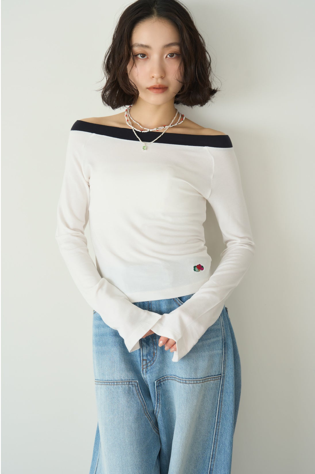 女性らしい首もとを演出するオフショルダー仕様に加え、
