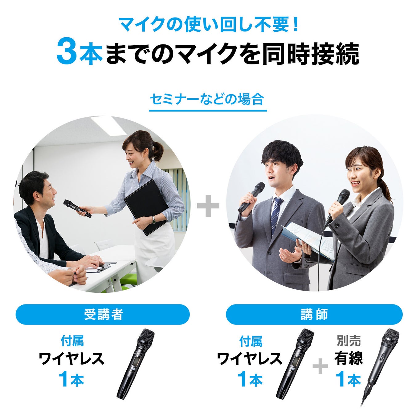ワイヤレスマイク2本(付属)、有線マイク1本(別売)の入力に対応しており、同時に3本接続することが可能です。広い会場内で自由に移動しながら同時に使用できます。