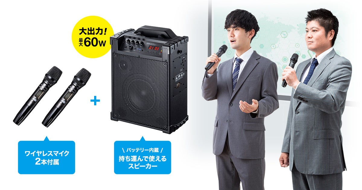 広い場所でも自由に移動しながら話せるワイヤレスマイク2本付き拡声器スピーカーを発売