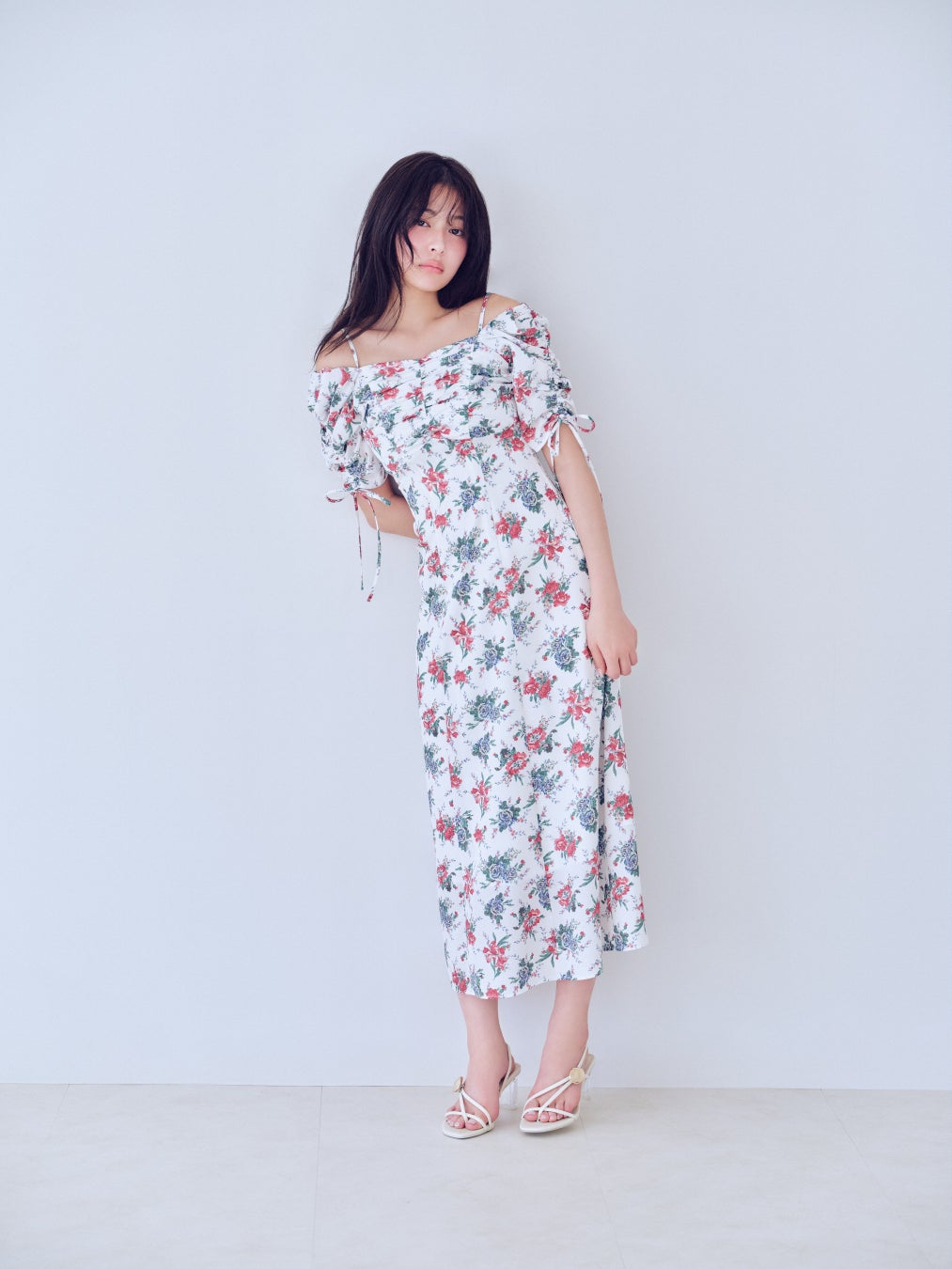 華やかなローズ柄が印象的なフラワープリントオフショルワンピース。