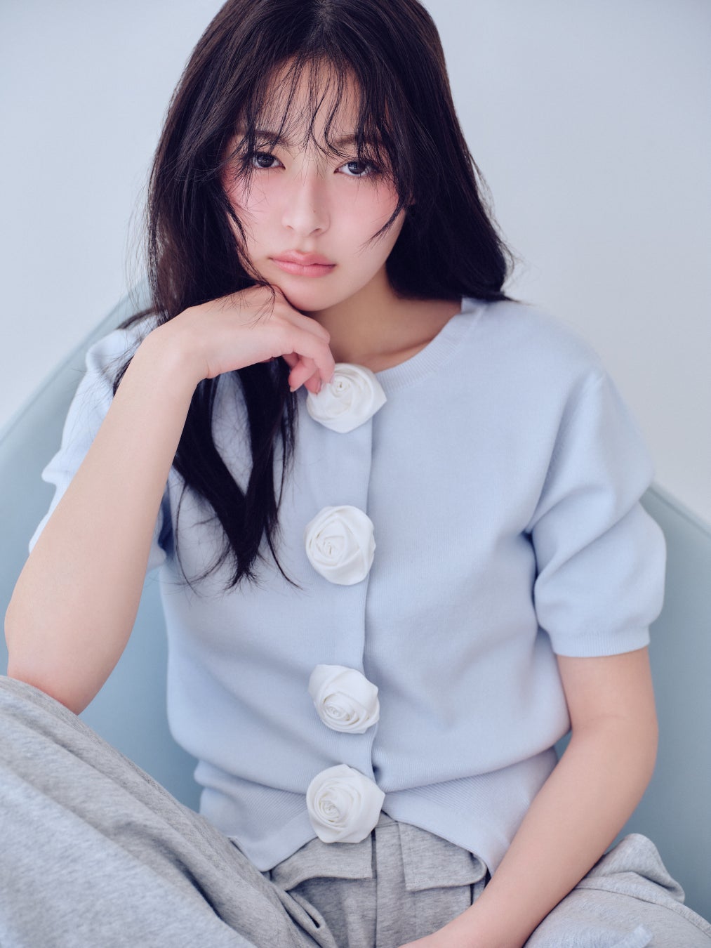 フロントにあしらった大きなサテンローズが印象的な存在感のあるカーディガン。