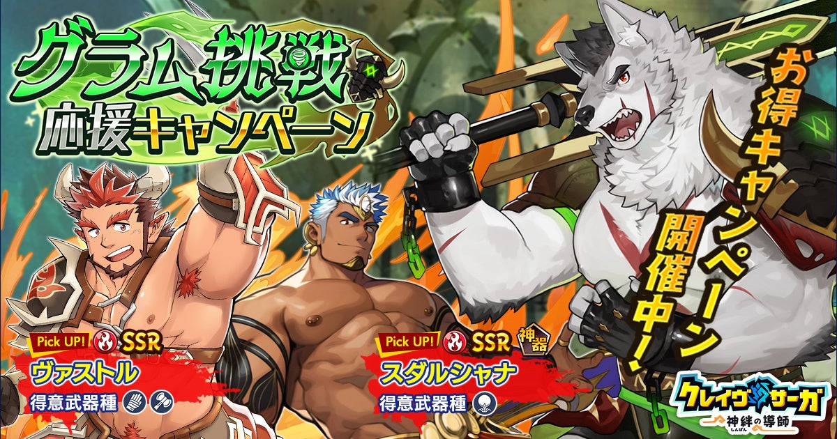 『クレイヴ・サーガ 神絆の導師』風属性レイドボス「グラム」挑戦応援キャンペーン開催!炎属性の新キャラ2体が追加されたガチャも登場!