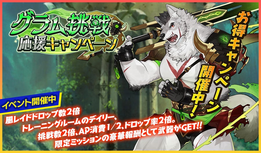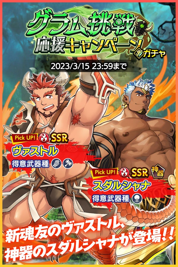 風属性の「グラム」に有利な炎属性の新キャラクターが登場! SSR魂友「ヴァストル」とSSR神器「スダルシャナ」が入手しやすい「グラム挑戦応援キャンペーンガチャ」をお見逃しなく。