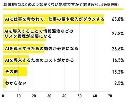 一方で、AIが「良くない影響をおよぼす」と感じている人は12.5%にとどまりましたが、具体的には「AIに仕事を奪われて、仕事の量や収入がダウンする」などの意見が多くありました。