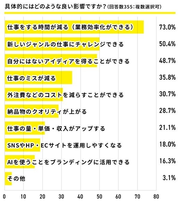 「良い影響をおよぼすと思う」と回答した人に、具体的にどんな影響を期待するのかを聞いたところ、「仕事をする時間が減る(業務効率化ができる)」がトップで73%。次いで「新しいジャンルの仕事にチャレンジできる」「自分にはないアイディアを得ることができる」などの意見が多くみられ、AIの活用による自己成長やキャリア拡大への期待が大きいことがわかりました。