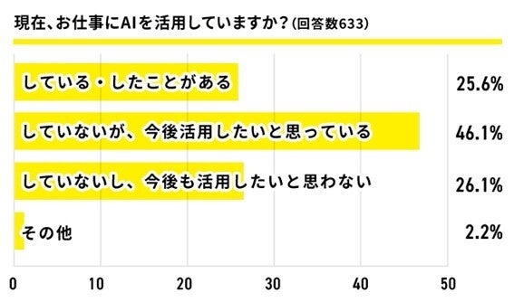 実際のAIの活用状況については、これまでにAIを活用「している・したことがある」という回答は25.6%で約4人に1人という結果になりました。「していないが、今後活用したいと思っている」という回答も46.1%とAIの活用に前向きな人が多いと考えられます。実際に活用している人の具体的な例としては「メルマガやバナーの文章作成(Webデザイナー)」「プログラミングのサポート(ITエンジニア)」「デザイン業務の際のブレインストーミングに活用(コンサルタント)」などがあがっています。