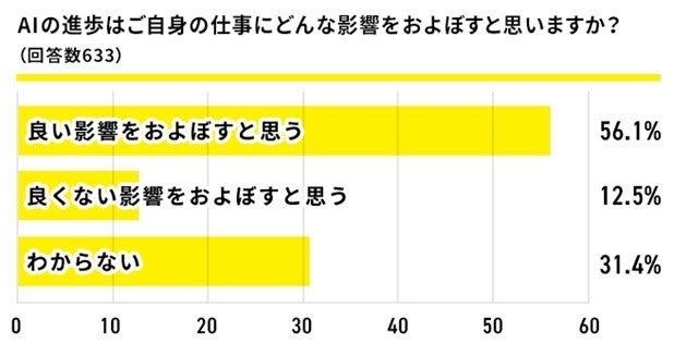 まず、現在『ChatGPT』をはじめとしたAIの進歩への注目が高まっている中で、AIの進歩が自身の仕事へどのような影響をおよぼすと思うかを質問したところ、「良い影響をおよぼすと思う」という回答が56.1%と半数を超えました。