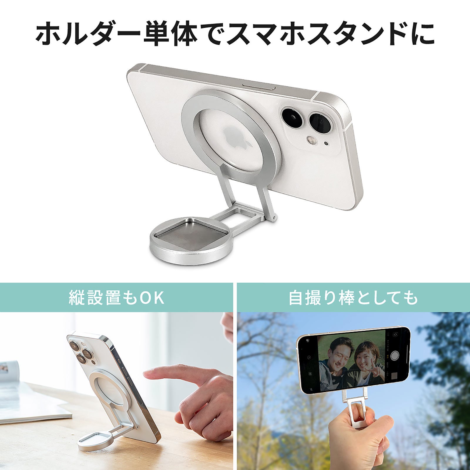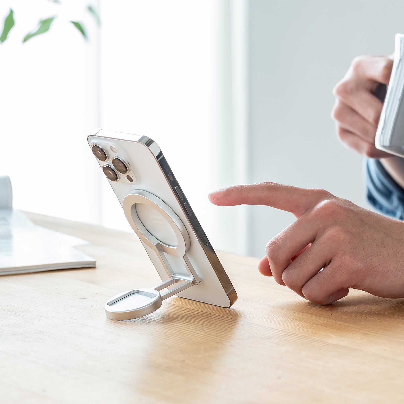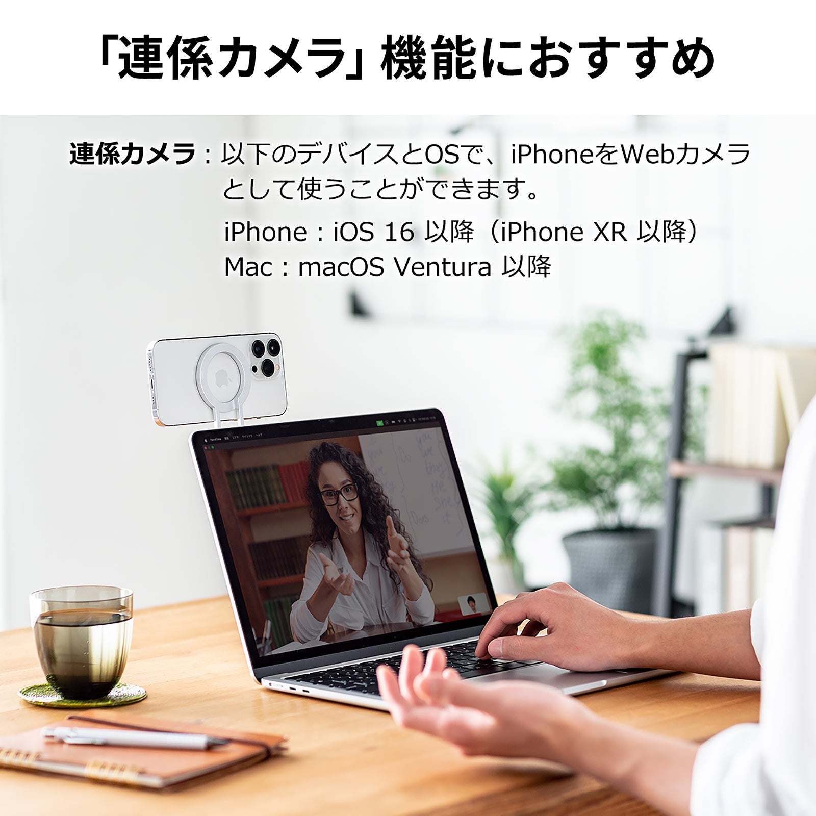MagSafe対応iPhoneをホルダーに磁力でピタッと固定して連係カメラ機能を使えます。