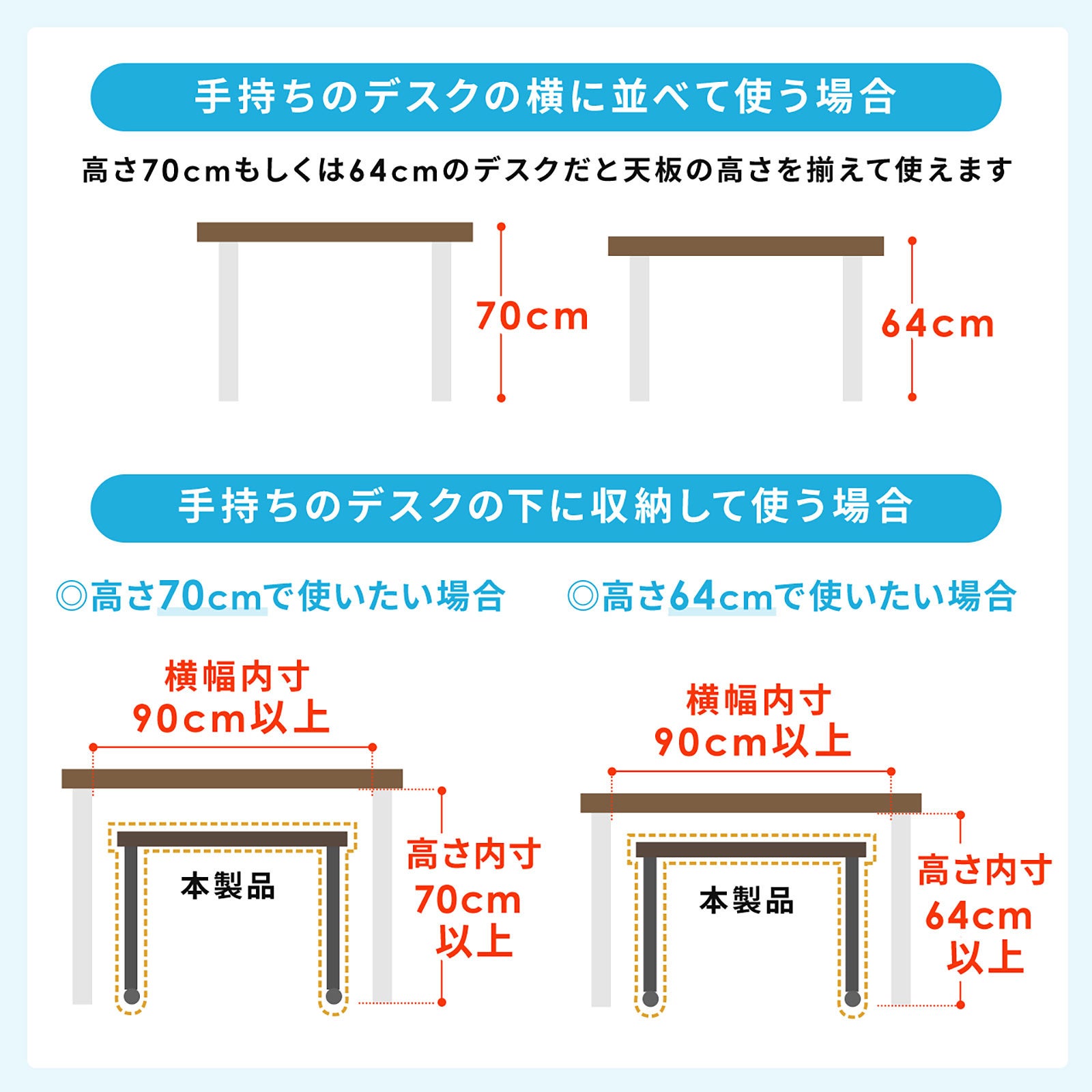 キャスター付きサブデスク 幅90cm 奥行35cm 高さ64cm/70cm