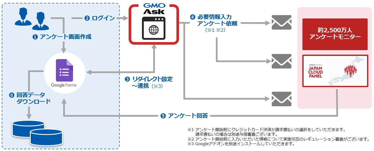 「GMO Ask」のウェブサイト(URL: https://gmoask.jp)から新規登録し、「Google Forms®」でアンケート画面を作成した後、調査対象者の希望条件などを入力することにより、「JAPAN Cloud Panel」で抽出したモニターに向けてアンケートを配信することができます。