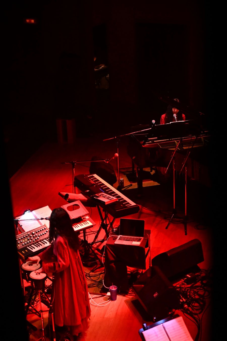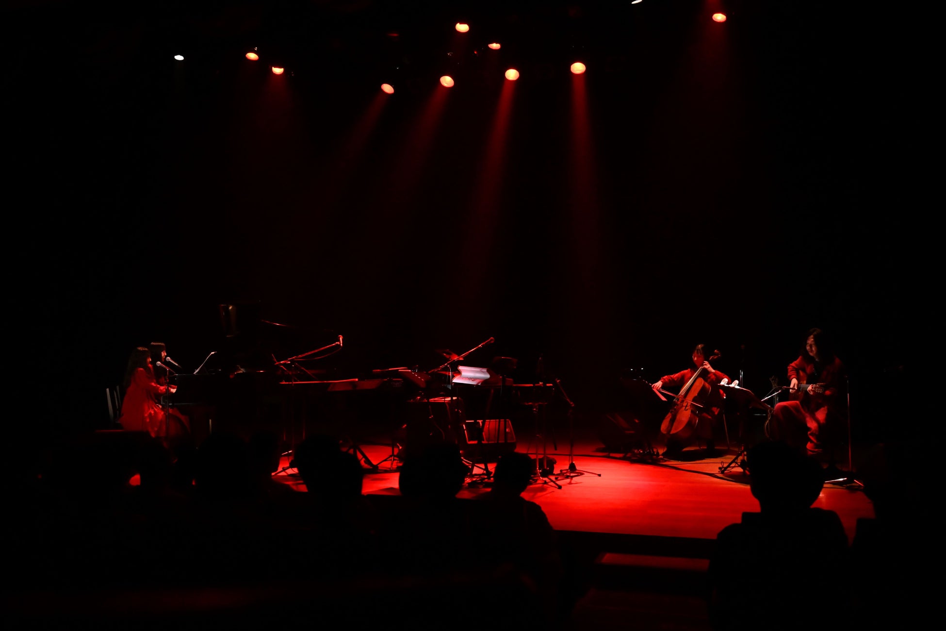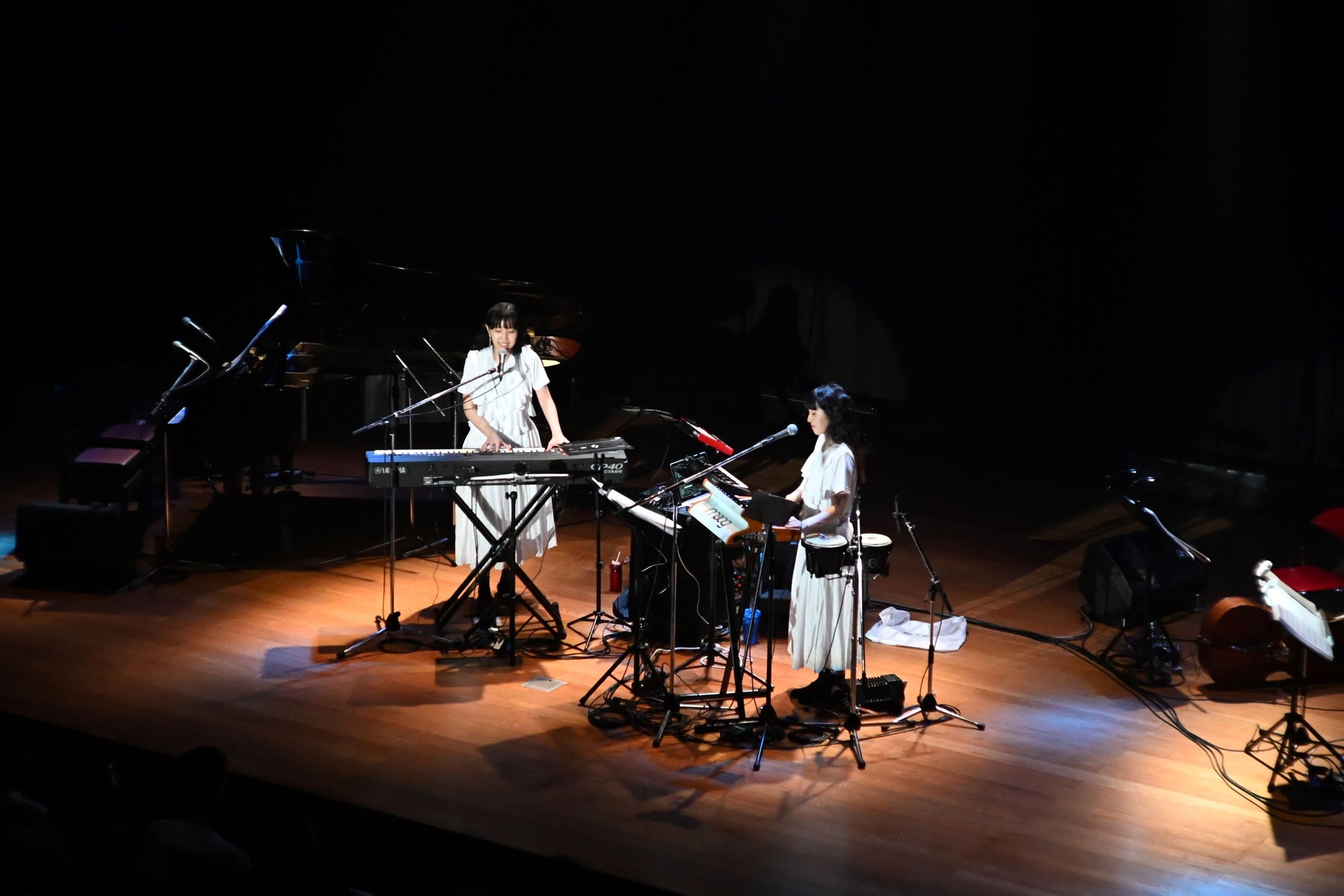 ケイト・ブッシュの『Night Scented Stock』が流れ、MonaとHinaが登場すると、客席は大きな拍手でふたりを迎える。第一幕のテーマは“Rouge”。Kitriのデビュー当時のイメージカラーである“赤”のワンピースを身に纏い、グランドピアノ前に置かれた長椅子にふたりで腰掛ける。照明によって赤く染められたステージで、早速連弾を奏で始めた。左側に座ったMonaが低音域を、右側に座ったHinaが高音域を担当し、各々フレーズをループさせていく。徐々に強度を増す波のような高音の美しさに浸っていると、赤い衣装を着た羊毛と吉良がジョイン。一気にサウンドの厚みと表情が変化し、MonaとHinaの<ハーァー>というコーラスが重なって最高の高まりを見せたかと思うとパッと演奏が止み、余韻が会場を包み込んだ。