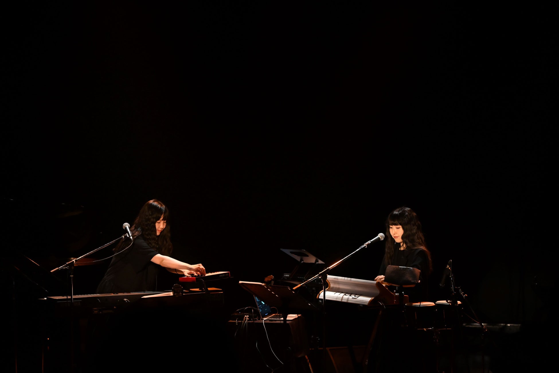 最初に演奏されたのは、未音源化の新曲だ。MonaとHinaはそれぞれキーボードとシンセの前に立ち、PCでの同期やコントローラーも使いながら、低音のデジタルビートをどんどん繰り出し、第一幕とは違う世界へとオーディエンスを連れていく。ピアノを弾いていた時は客席に背中を向けていたが、正面を向いたことでふたりの手元がよく見え、オーディエンスも“どこからこの音が鳴っているんだろう”と言わんばかりに、食い入るように演奏を見つめていた。曲の途中ではHinaがMonaのキーボードの隣に行って力強く連弾をする場面もあり、展開の多さに驚きを隠せない。壮大な世界観の中にどこかひんやりした印象を感じるナンバーだった。