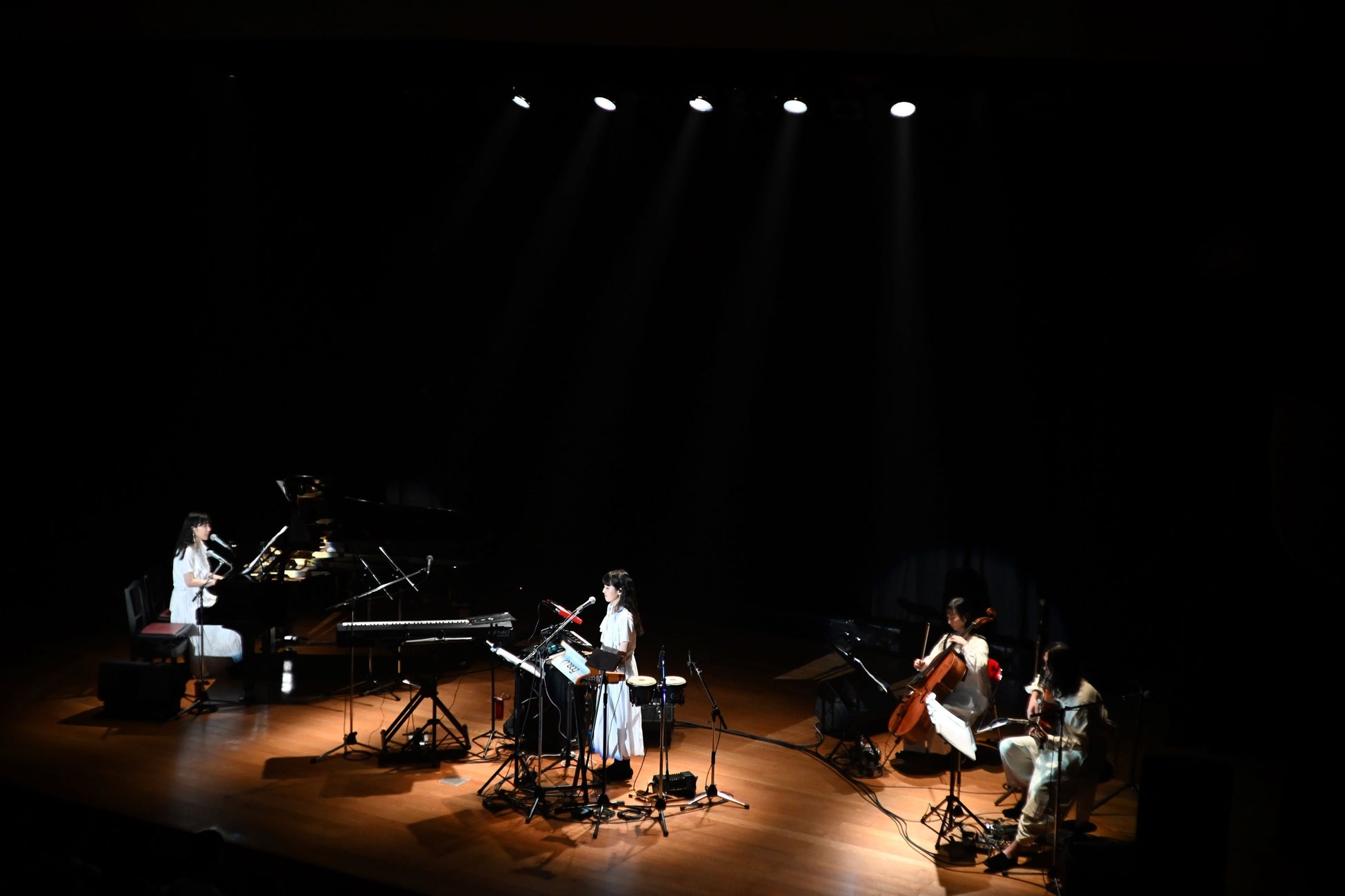 ステージには、下手にグランドピアノ、中央に2台のキーボードやシンセ、上手にチェロ、ギター、マンドリンがセッティングされていた。この日サポートをつとめるのは、2019年〜2022年まで年に2回ずつ行われたワンマンライブ『キトリの音楽会』にもずっと出演していた羊毛(Gt.&Mand./羊毛とおはな)と吉良都(Vc.)。Kitriとは気心の知れた関係性だ。