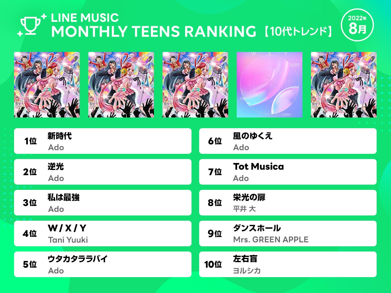 そのほか、引き続き4位には今年ロングヒットを記録し続けているTani Yuukiの「 W / X / Y 」がランクイン 。LINE MUSICの10代トレンドランキングでは、2022年2月から5月まで4ヶ月連続で1位を獲得し、上半期ト レンドランキングでも1位を獲得。SNSでも人気の鉄板曲として親しまれています。