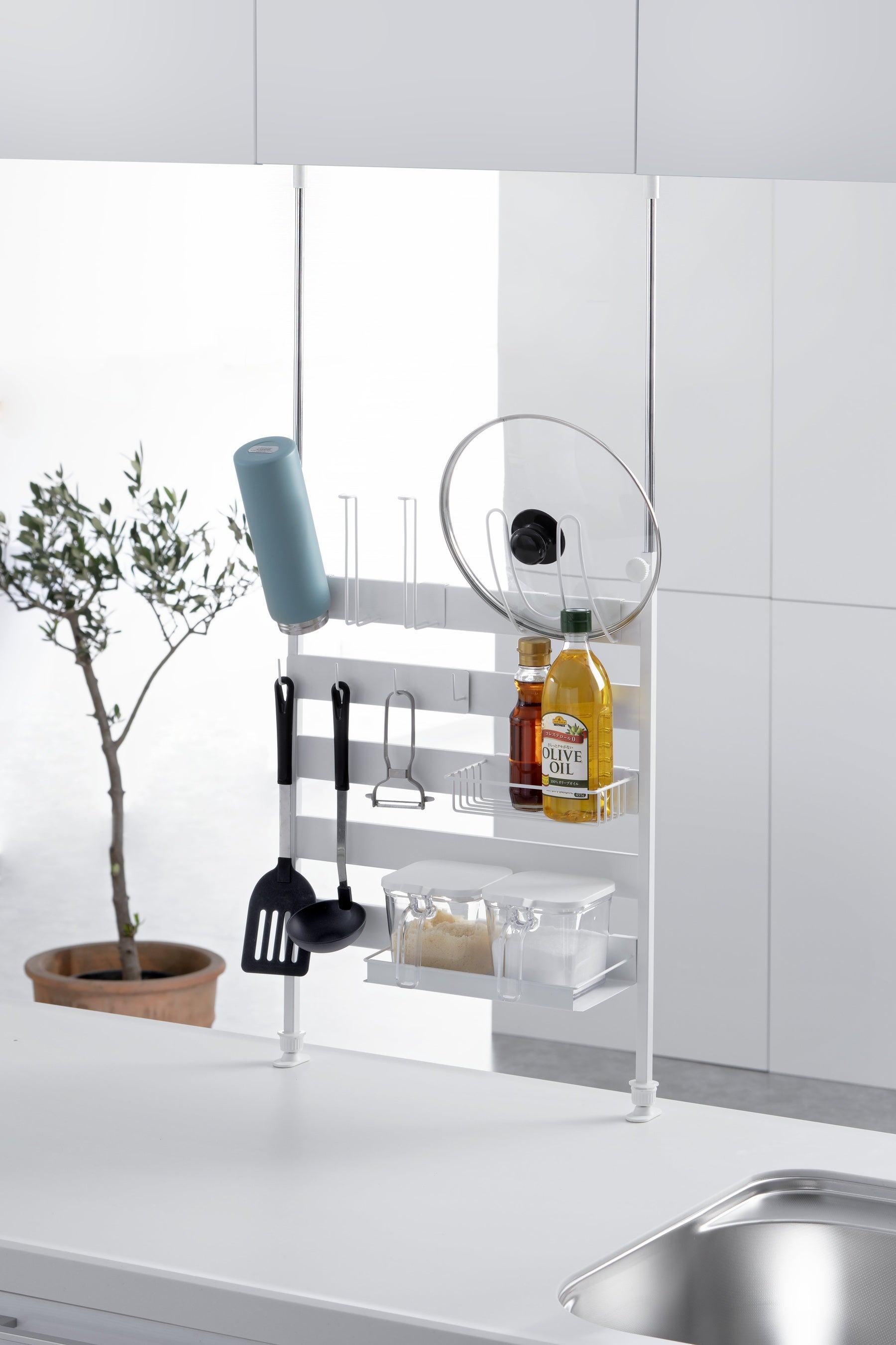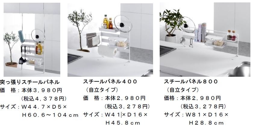 スチールパネルと収納のフックパーツ・マグネットパーツをキッチンの使用シーンや用途に合わせて組み合わせ可能です。スチールパネルは自立タイプと突っ張りタイプがあり、フックパーツの鍋蓋・ボトルスタンドやまな板かけは、置き場所に困るものを収納出来て便利です。
