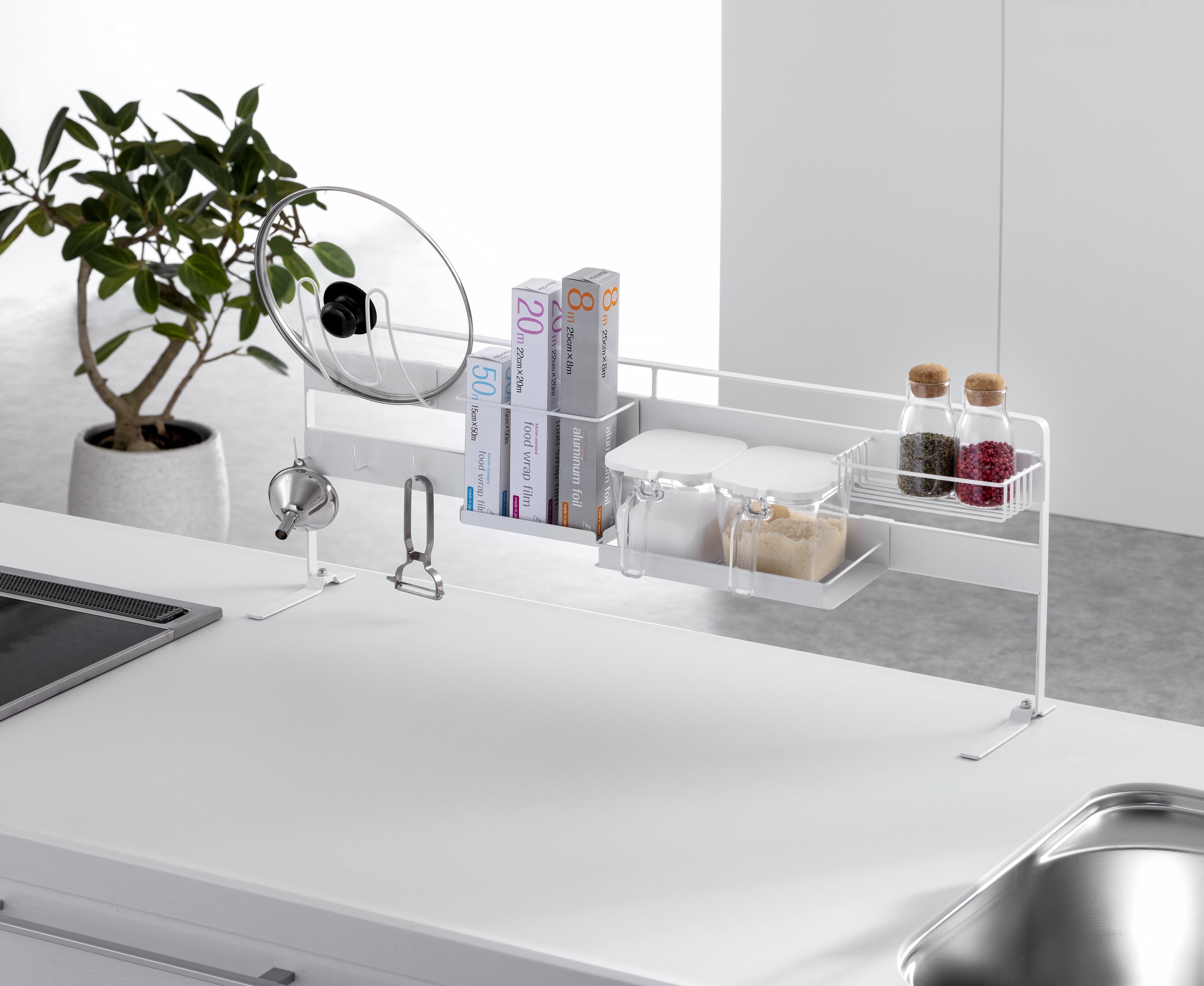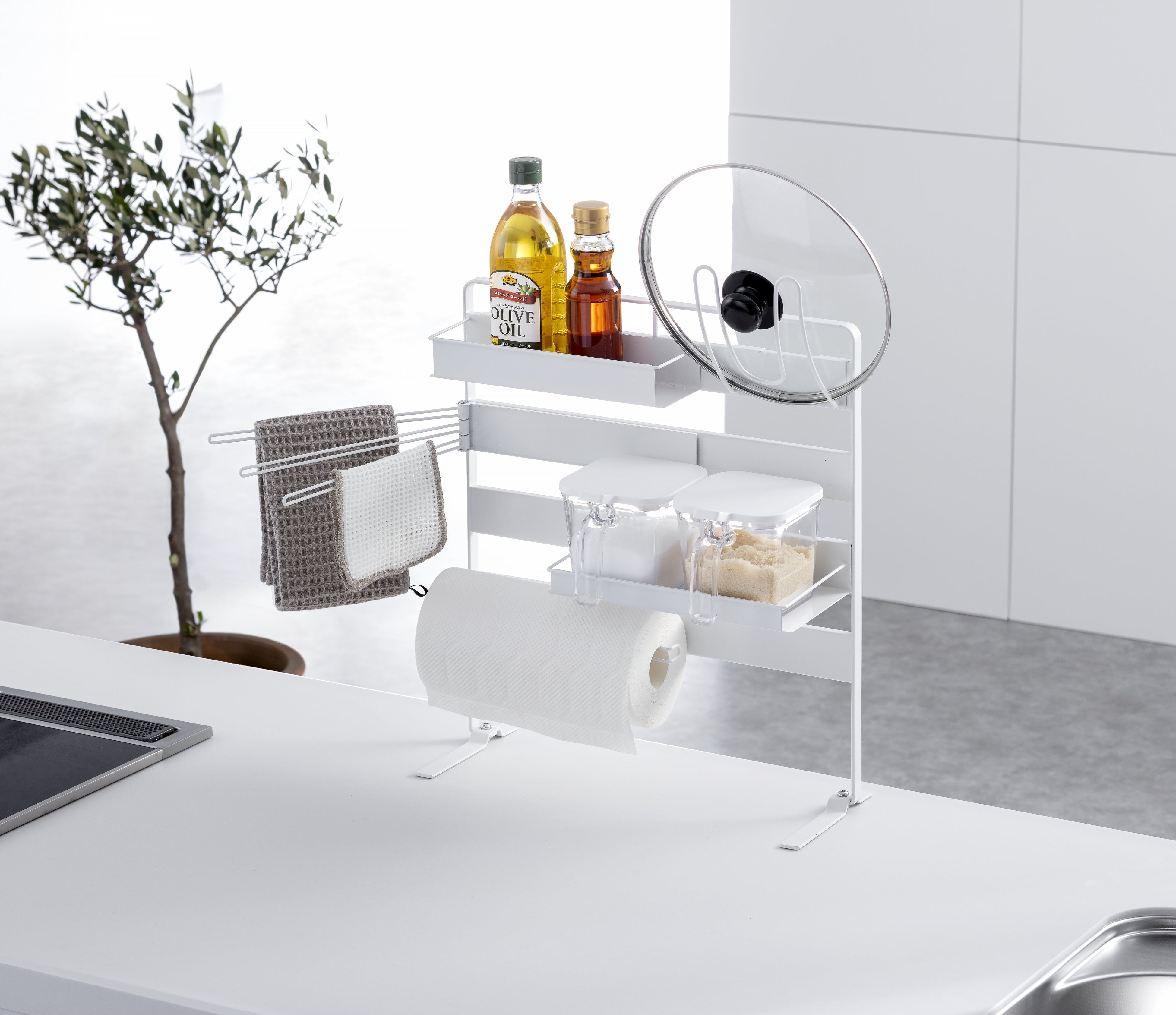 スチールパネルとシェルフやラックなどのパーツを組み合わせることで収納を増やし、キッチンの作業スペースが確保できます。スタンドタイプと組み合わせて、統一したデザインで“見せる収納”が可能です。