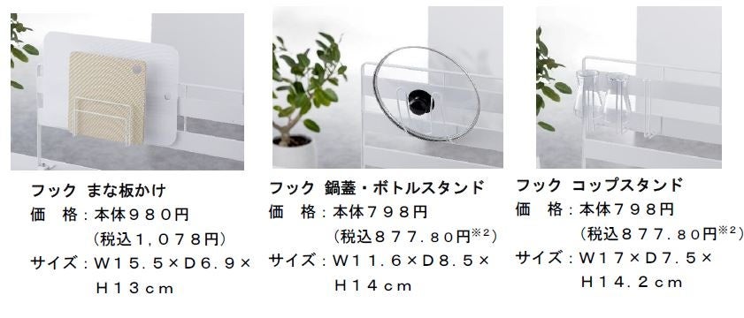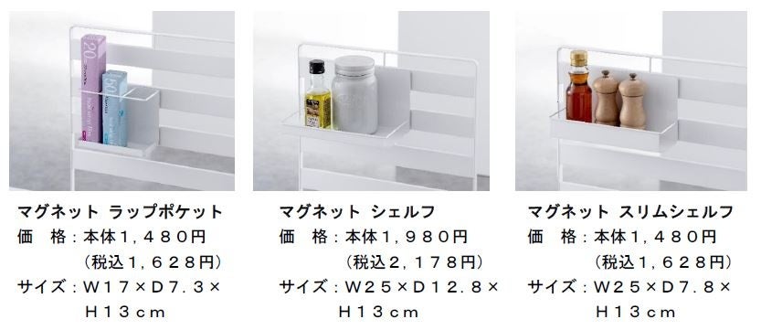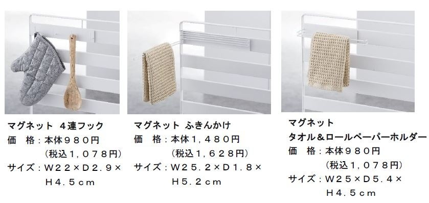 キッチンの場所と設置場所のスペースに合わせて3種類から選べます。別売りのフック・マグネットパーツの収納を取り付けて自由に組み合わせられます。