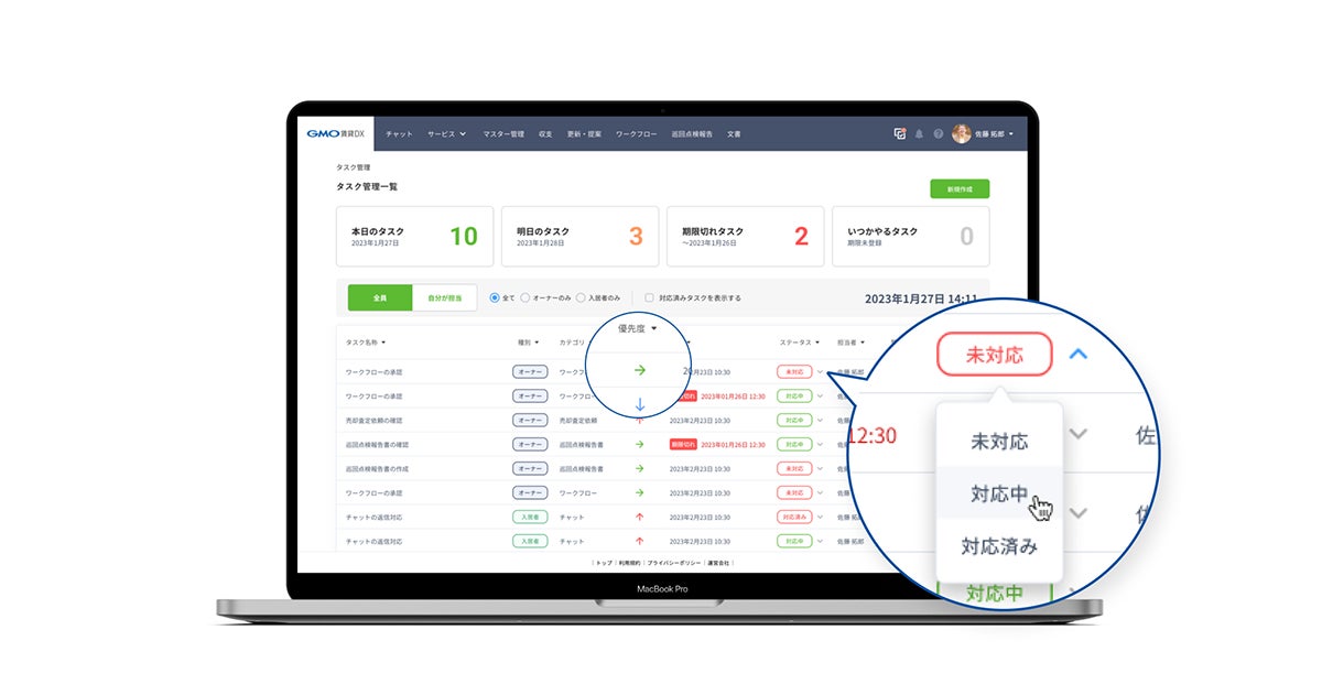 さらに、『タスク管理機能』のアップデートを行うことにより、担当者全体のタスクを閲覧できるようになるとともに、タスクの「優先度」「ステータス」を設定が可能になり、業務効率化をサポートいたします。