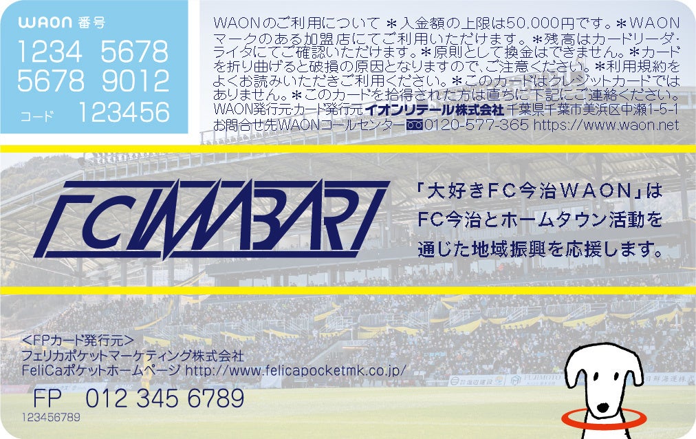 「サッカー大好きWAON」は、「いつもクラブを応援していたい」というサポーターの想いをクラブに届ける電子マネー「WAON」です。サポーターはお買物や飲食などでの利用を通じて、シーズン中はもちろんシーズンオフ期間中もホームタウンの経済活性化やクラブの成長に関わることができます。全国のWAON加盟店で利用することによりサポーターの想いを全国まで届けられ、「サッカー大好きWAON」のご利用金額の一部が、「FC今治」のホームタウン活動※1に役立てられます。
