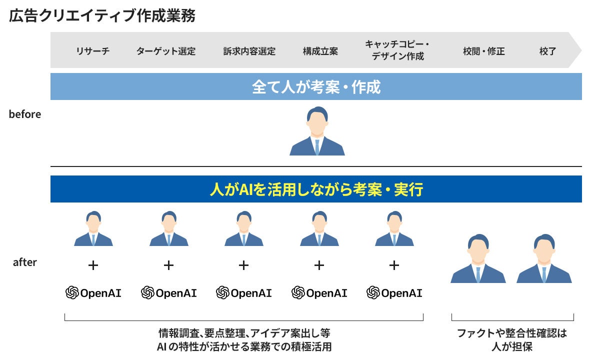 これまで人間が担っていた、広告の事前リサーチ、アイデア出し、実際の画像や動画の作成作業などに「ChatGPT」を活用することで、クリエーターなどが、削減した時間で、広告効果やマーケティング施策の改善にこれまで以上に注力できるようになりました。これにより、お客様に迅速かつよりよい広告出稿のご提案ができるようになるなどの効果が生まれています。