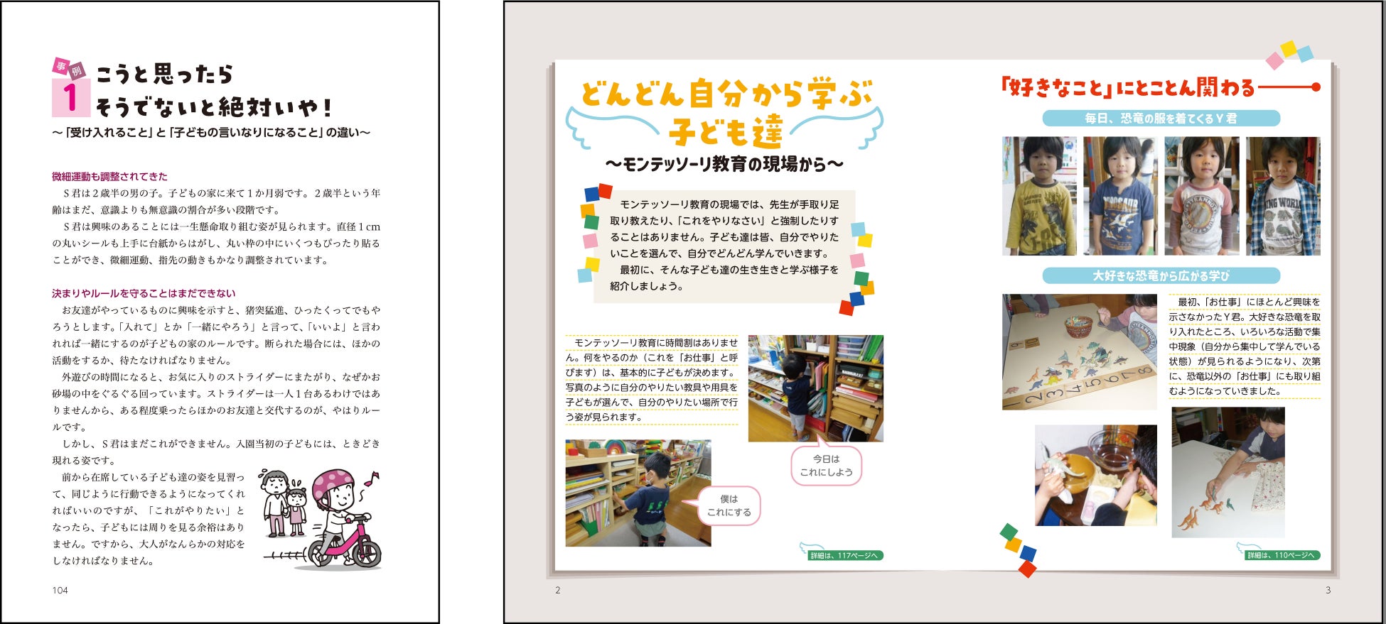 モンテッソーリ教育の考え方は理解できても、実際に子供が学んで行く中で、「こんな時どうしたらいいの?」という場面がたくさん出てくるでしょう。そうした場面の具体例として9個の事例を取り上げ、子供の様子をどう捉え、大人はどうふるまえばいいのか、解説しています。