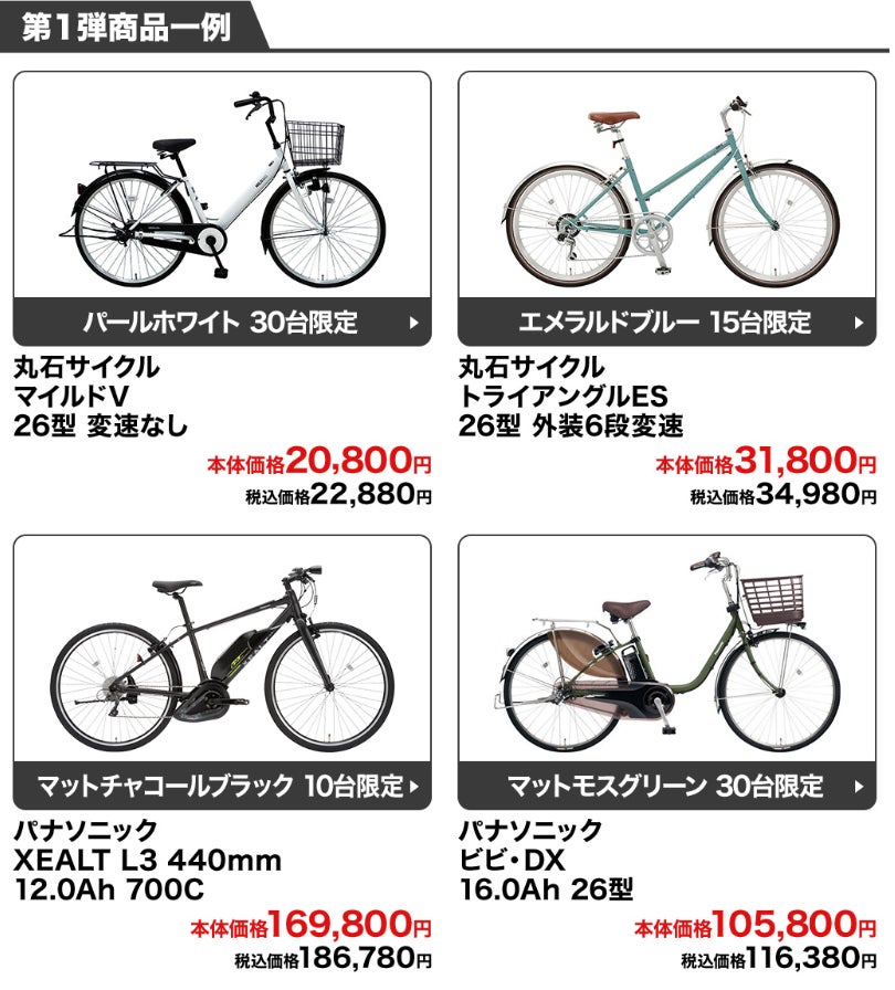 第1弾と第2弾の2本立てで、各回いずれも幅広いラインナップのおトクな自転車を台数限定の特価でご提供します。スポーツサイクル、電動アシストサイクル(シティタイプ・スポーツタイプ・子乗せタイプ)、小径・折りたたみサイクル、シティ・ファミリーサイクル、キッズ・ジュニアサイクルなど期間によって商品のラインナップは変わります。台数限定ならではのおトクな商品をご期待ください。