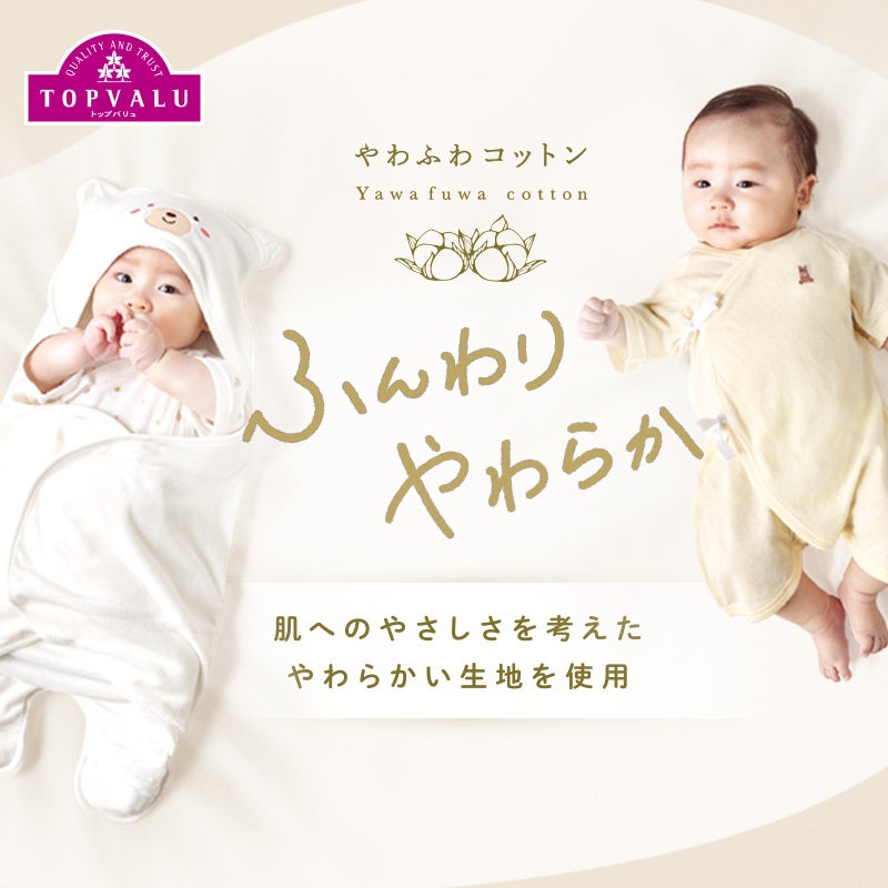 赤ちゃんの肌は、汗やよだれ、涙によって乾燥しやすいほか、拭いたときや衣服の摩擦など少しの刺激が肌の痒みやかぶれの原因になることがあり、とてもデリケートで肌トラブルが起きやすいとされています。こうしたなか当社は、糸をほとんど撚っていない無撚糸からつくったやわらかい肌あたりの素材の使用や、肌に刺激を与えないように熱圧着のワッペンを取り付けるなどやさしい肌あたりにこだわった「トップバリュ やわふわコットンシリーズ」を企画・開発しました。