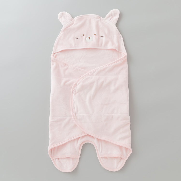 赤ちゃんをくるむ側の内側は綿100%で心地よい肌ざわりです。スナップボタンで、はだけにくく、足元は覆うことも出すことも可能な便利な仕様になっています。アニマル柄のフードの可愛らしいデザインです。