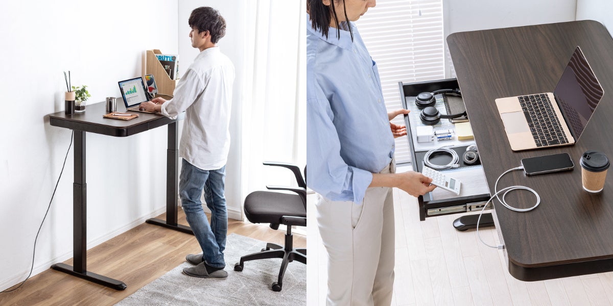 引き出しと充電用USBポート(Type-C×1・Type-A×1)が付いた電動昇降デスクを2月7日に発売