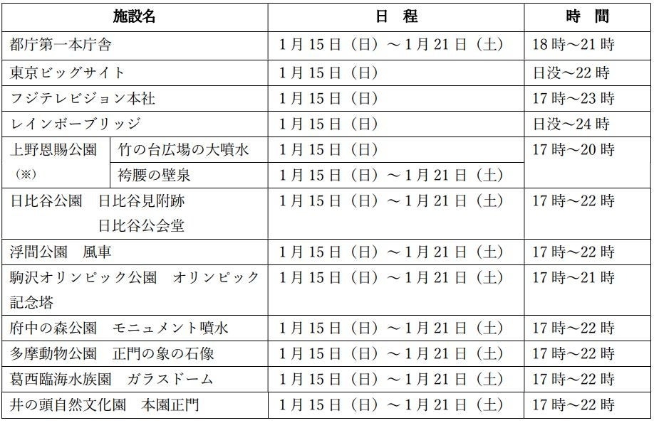 で都庁第一本庁舎やレインボーブリッジ、都立公園など都内12の施設を1月15日から同時にライトアップしま
