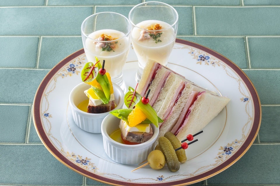 セイボリーには、紅茶の香りを忍ばせたキノコのスープや紅茶鴨のピンチョスのほか、新玉葱を用いたムースなど、紅茶のニュアンスを取り入れたメニューと、春らしさを意識したメニューが並びます。甘い・しょっぱいのバランスにも配慮し、最後まで飽きのこない構成に仕上げました
