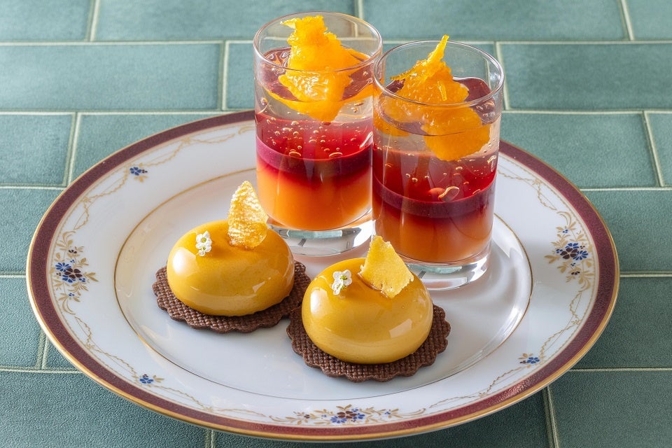 【上段】アールグレイとホワイトチョコレートのムース、カシスとブラッドオレンジのヴェリーヌ