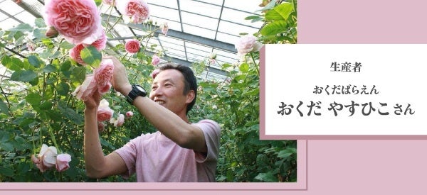 京都市伏見区・深草にある「おくだばらえん」の二代目。アメリカでバラの栽培技術を学んだのち、農薬に頼らずバラ本来の美しさを引き出す栽培法へと転換。ハーブの抽出液や木酢液・竹酢液など自然由来の素材を使い、生命力あふれる美しいバラを育てている。その栽培技術は高く評価され、2021年には全国2,000人のバラ栽培者の中から選出される「5人のバラ職人」に選ばれる。栽培されたバラは香りや味わいにも優れ、食用やスイーツ素材としても注目されている。自然への敬意と人への想いを込め、一本一本に愛情を注ぎ育てられたバラは、見る人・触れる人の心を豊かにする力を持っている。