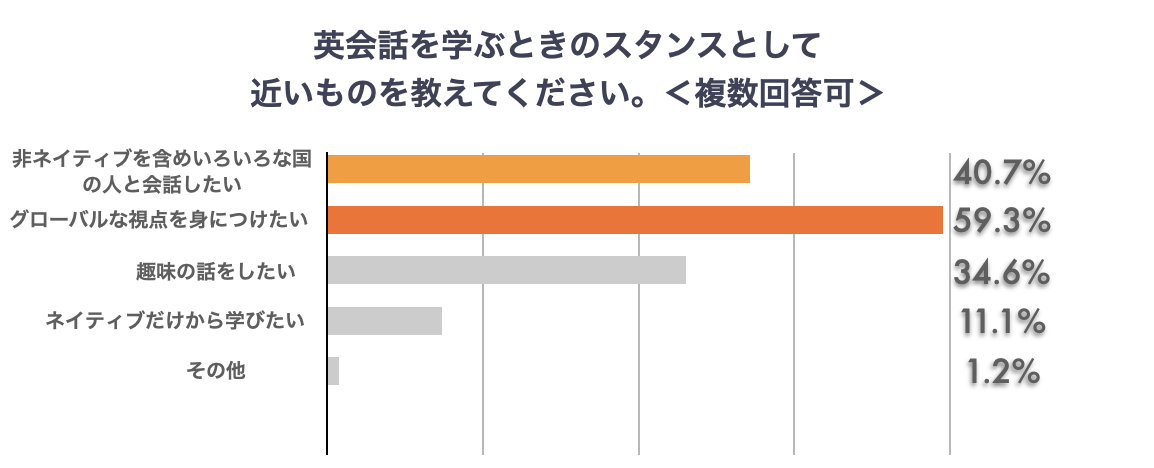 また上記質問で「かなりそう思う」「ややそう思う」「どちらともいえない」と答えた人に「英会話を学ぶときのスタンスとして近いものを教えてください。」と質問したところ、「グローバルな視点を身につけたい」(59.3%)、「非ネイティブを含めいろいろな国の人と会話したい」(40.7%)が続き、「ネイティブだけから学びたい」は11.1%に留まりました。