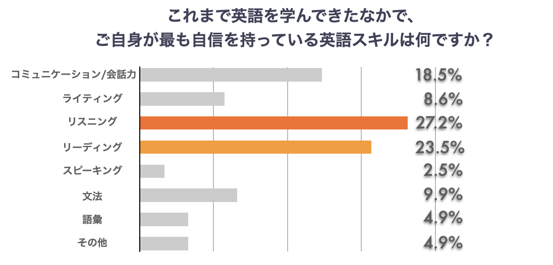 「これまで英語を学んできたなかで、ご自身が最も自信を持っている英語スキルは何ですか?」と質問したところ、最も多い回答は「リスニング」(27.2%)、次いで「リーディング」(23.5%)という結果となりました。