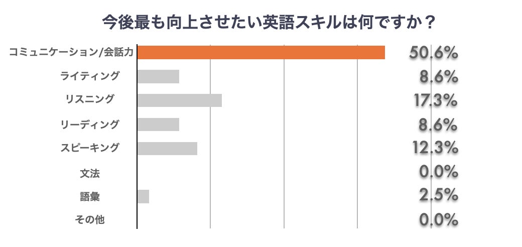 今後最も向上させたい英語スキルは「コミュニケーション/会話力」(50.6%)