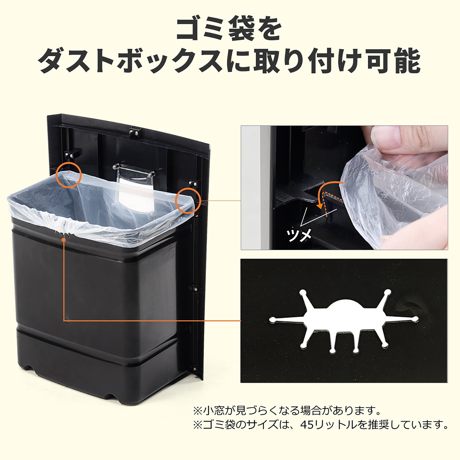 ダストボックスに小窓が付いており、細断クズのたまり具合を外から確認できます。ダクトボックスにはゴミ袋を引っ掛けるツメを搭載しています。