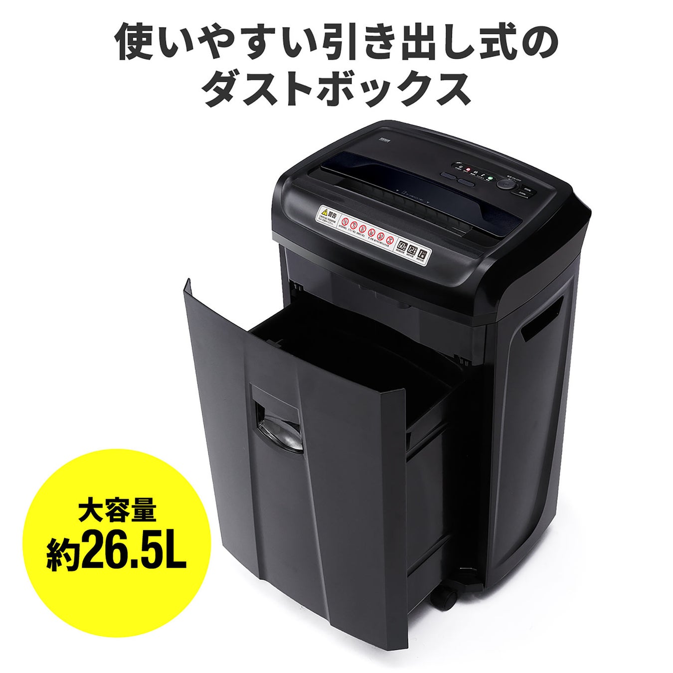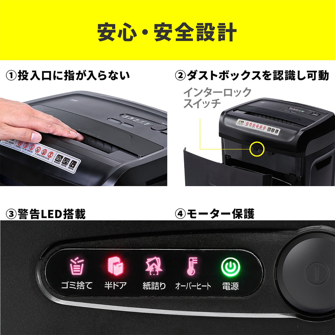 投入口は指が入らない安全設計です。ダストボックスが正しい位置にないと動作しない、インターロックスイッチを搭載しています。シュレッダーの状況が一目で分かる警告LED付きです。