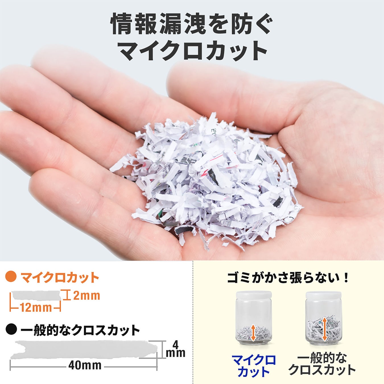 細断形状は、2×12mmマイクロカットです。クレジットカードなどの各種カードを1枚ずつマイクロカット細断が可能です。