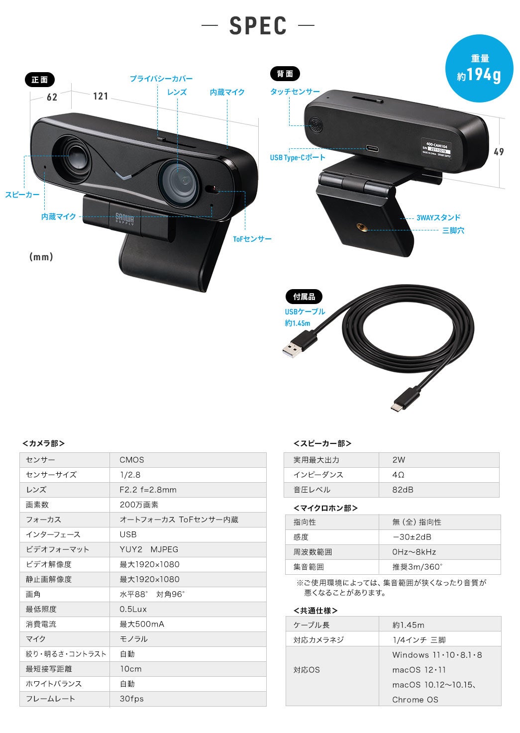 サンワサプライ株式会社(本社:岡山市北区田町1-10-1、 代表取締役社長 山田 和範)が運営している直販サイト『サンワダイレクト』では、高速ピント調整可能なTOFセンサーを内蔵し、スピーカー・ノイズキャンセルマイクも搭載した3 in 1タイプのオートフォーカスWEBカメラ「400-CAM104」を発売しました。