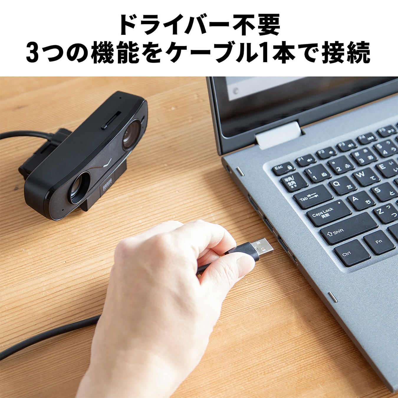 USBビデオクラス(UVC)対応でなのでドライバ不要で、ケーブル1本だけでカメラもマイクもスピーカーも動作します。