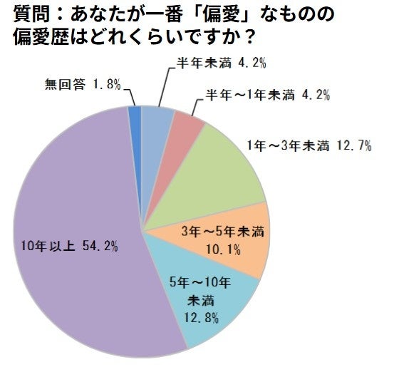 アンケート回答者の約60%が「偏愛しているモノ・コト・テーマがある」と回答しました。さらに半数以上が偏愛歴が「10年以上」と回答しました。