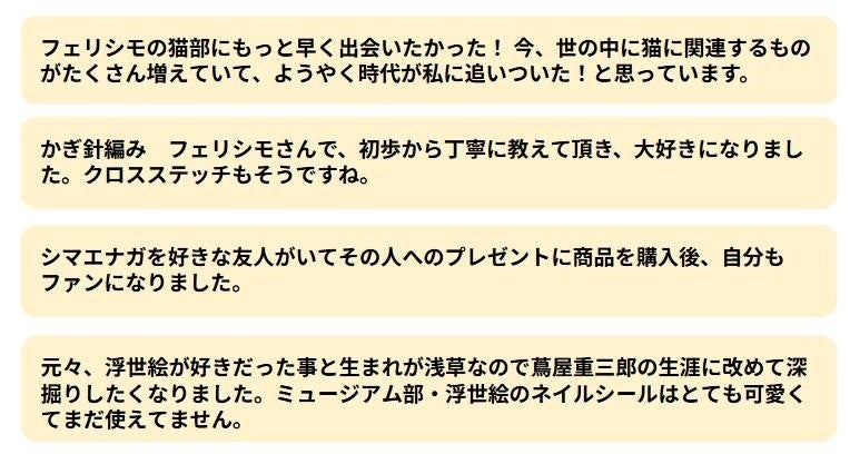 「偏愛歴10年以上」と回答した方々の中で、最も多かった“偏愛の対象”は、「猫」でした。続いて「編み物」や「手芸」が多く挙げられています。「フェリシモ部活」のみならず、フェリシモスタッフが情熱を込めて作り出す企画や商品がお客さまの共感を呼び“偏愛”を満たしています。