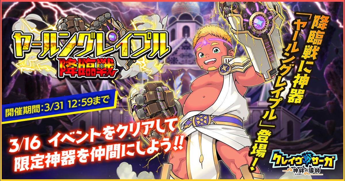SR魂友「サカマタ」とSSR魂友「サーベルト」、SSR神器「アスカロン」が入手しやすい「ヤールングレイプル降臨戦ガチャ」をお見逃しなく。