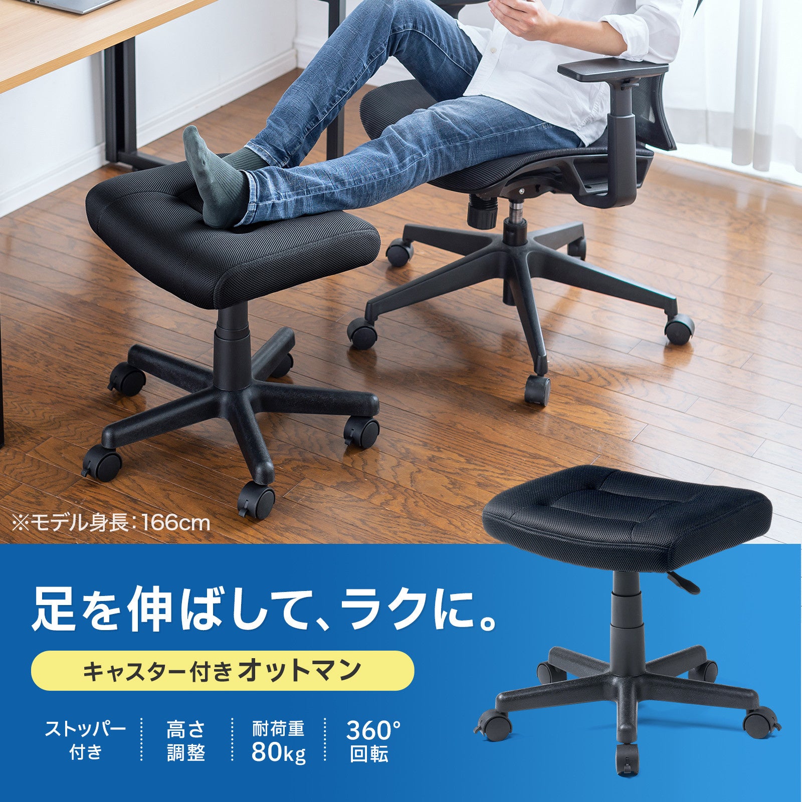 サンワサプライ株式会社(本社:岡山市北区田町1-10-1、代表取締役社長 山田和範)は、いつものチェアで足を伸ばしてリラックスできる、キャスター付きのオットマン「SNC-OT1BK」を発売します。
